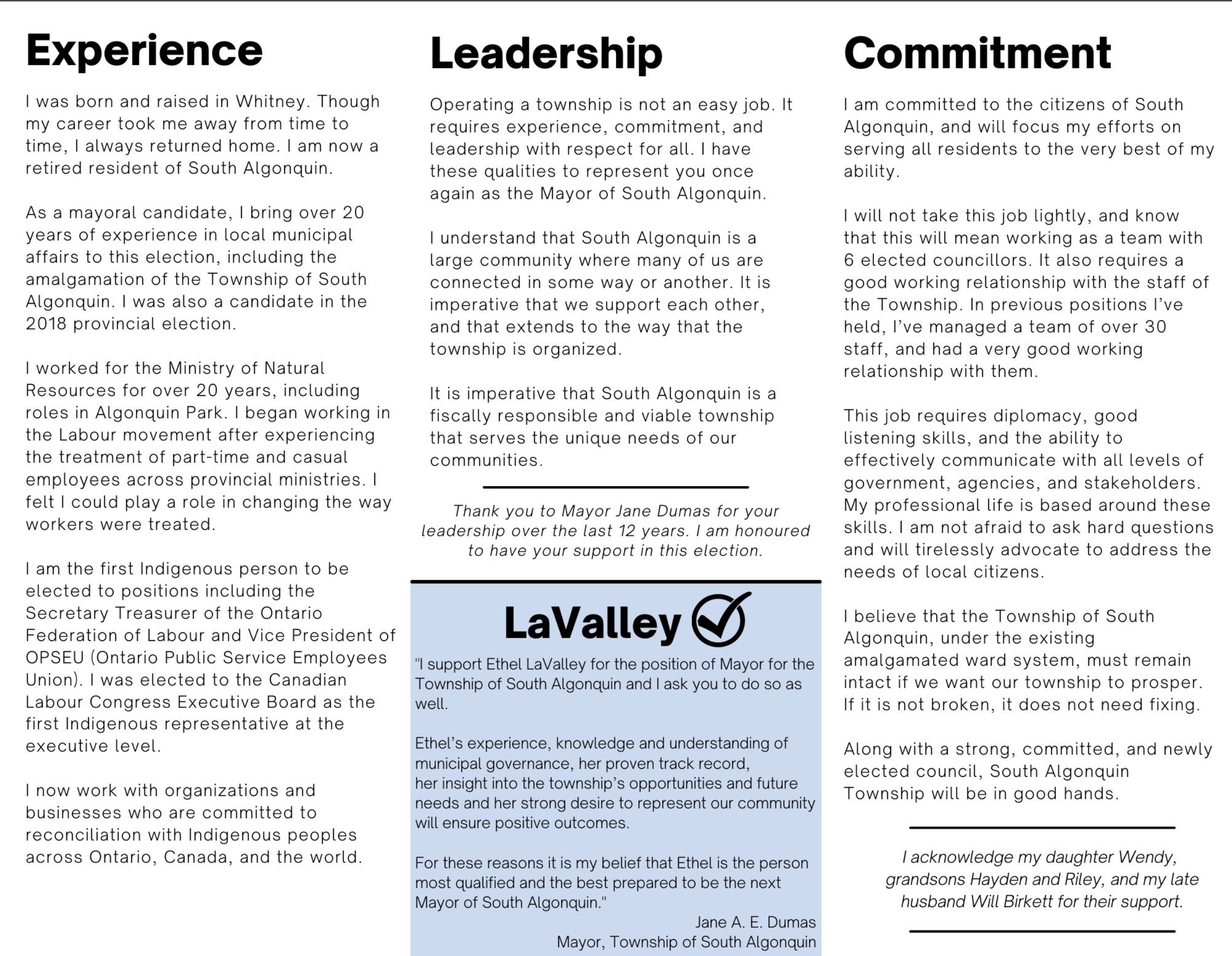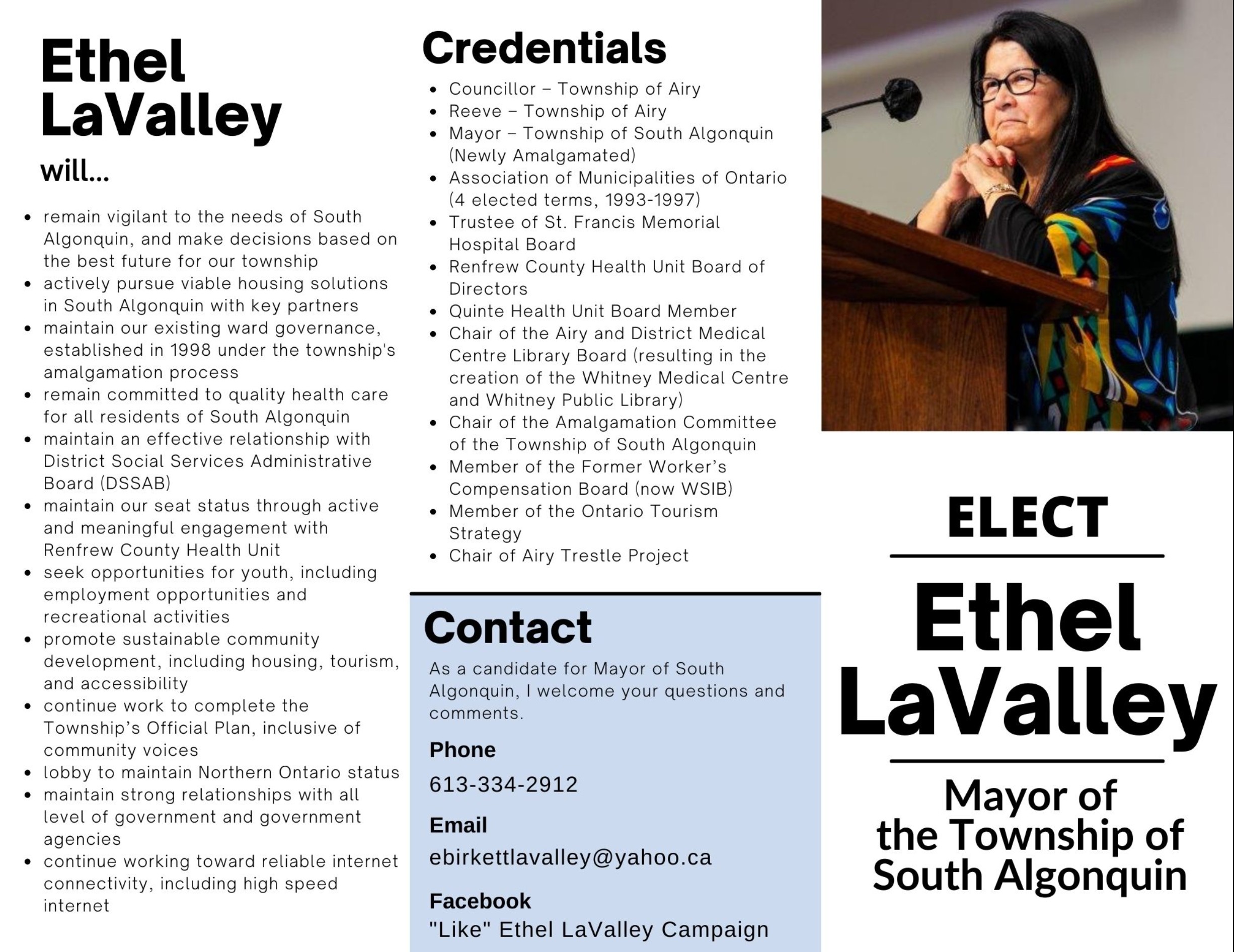 Campaign material from the 2022 municipal election presented housing as a key priority for mayoral candidate Ethel LaValley.