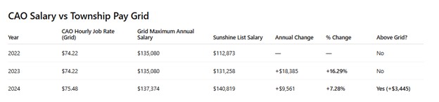 3. Salary exceeded the pay grid in 2024 – Based on the township’s 2024 pay grid, the maximum salary calculated from the job rate was approximately: $137,373. The reported Sunshine List salary was: $140,819. This is about $3,445 above the grid maximum.